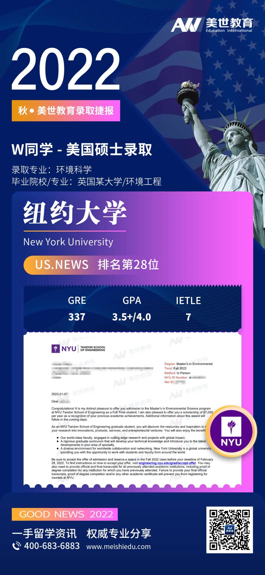 其中美世Y同学斩获U.S.News排名第二位的哥伦比亚大学硕士录取;W同学斩获U.S.News排名第八位的宾夕法尼亚大学硕士录取;Z同学斩获纽约大学硕士录取并获得每学期6000刀奖学金……