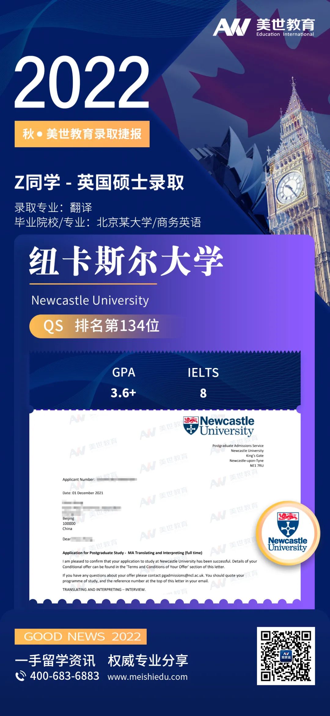 值得一提的是,纽卡斯尔大学的翻译专业硕士在英国排名TOP3,真的要恭喜Z同学!