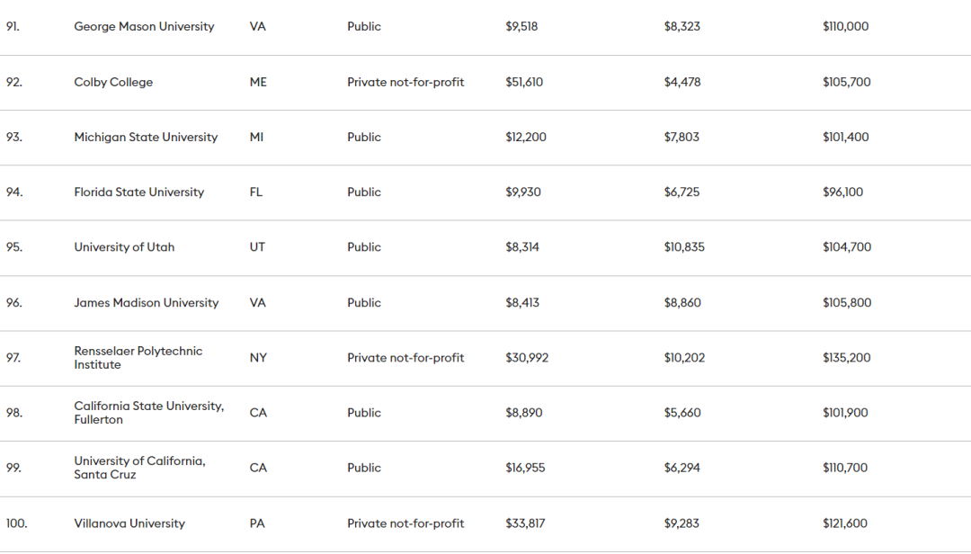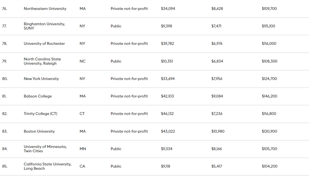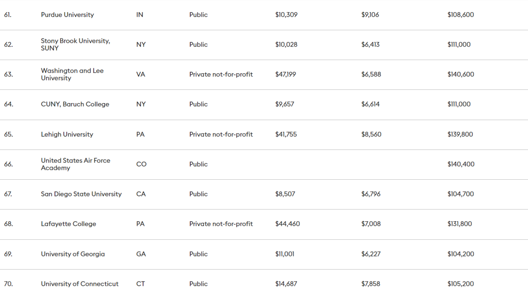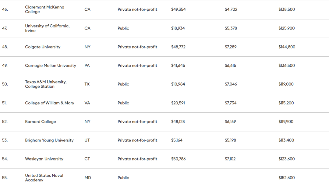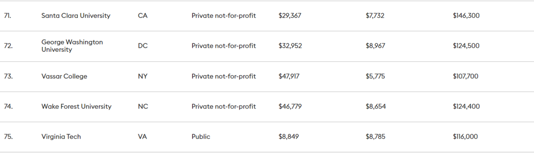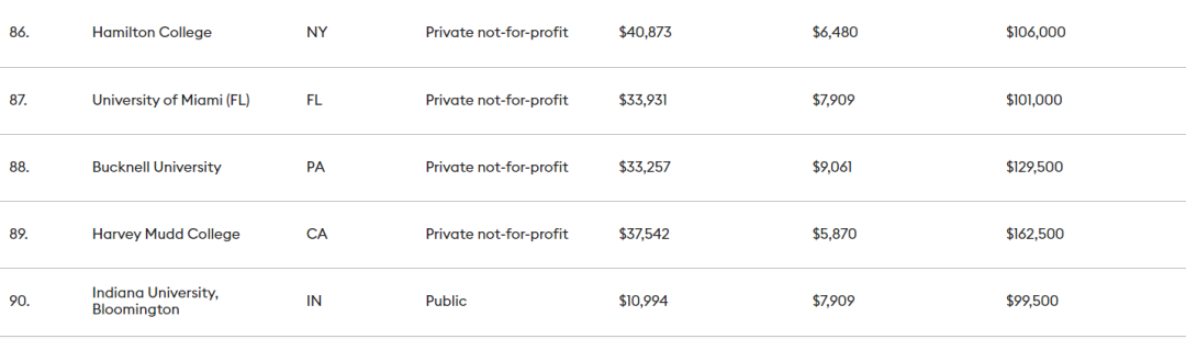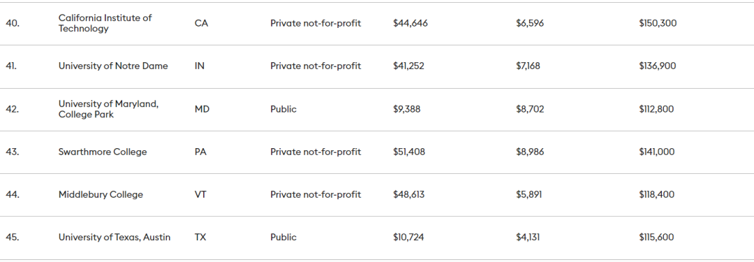 与我们所熟知的U.S.News、QS和THE等榜单注重学术成就不同,福布斯这份榜单的评估基准不仅仅在于学术表现、学科排名和录取率等方面,更侧重于投资回报率,也就是我们常说的学费低、好毕业,起薪还高的综合排名。