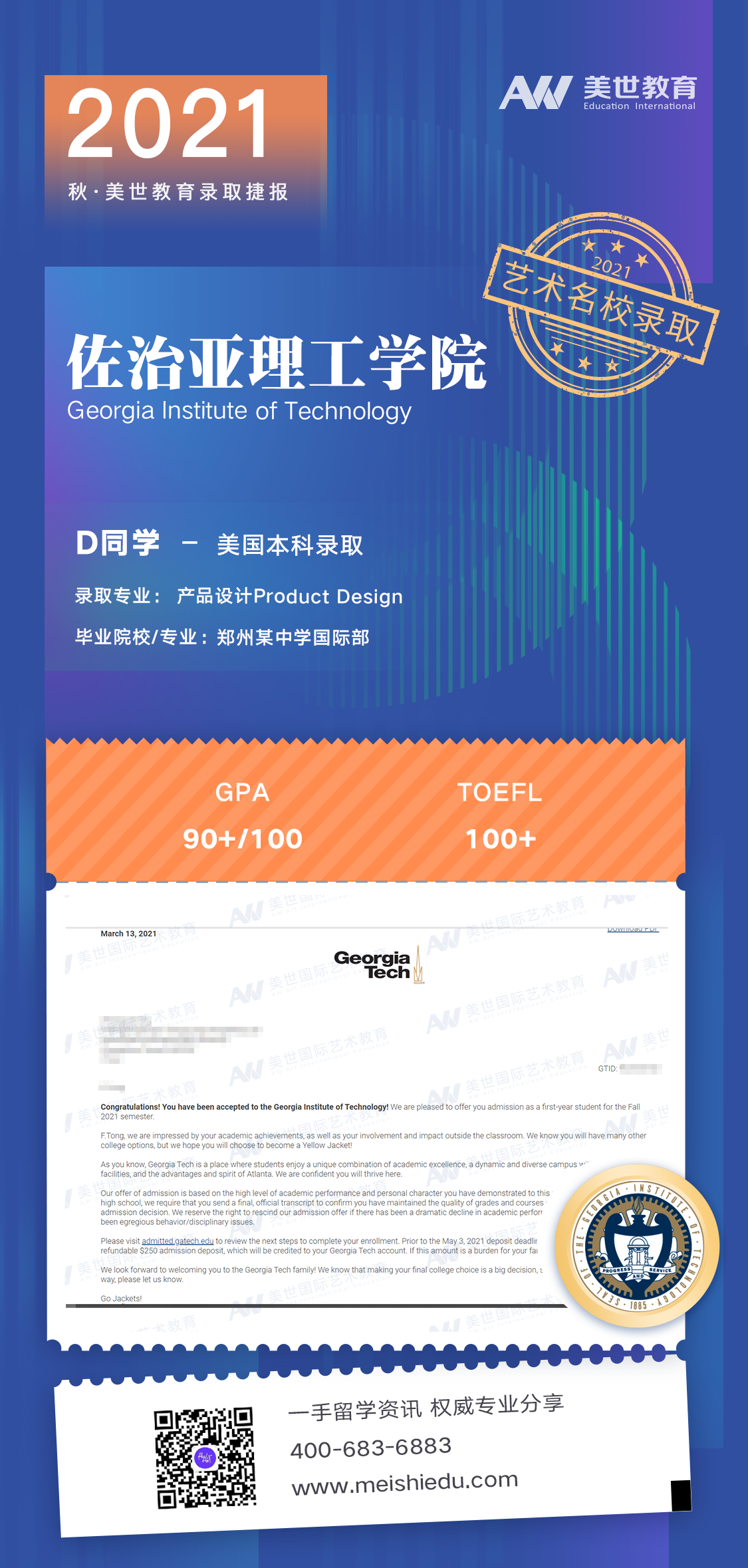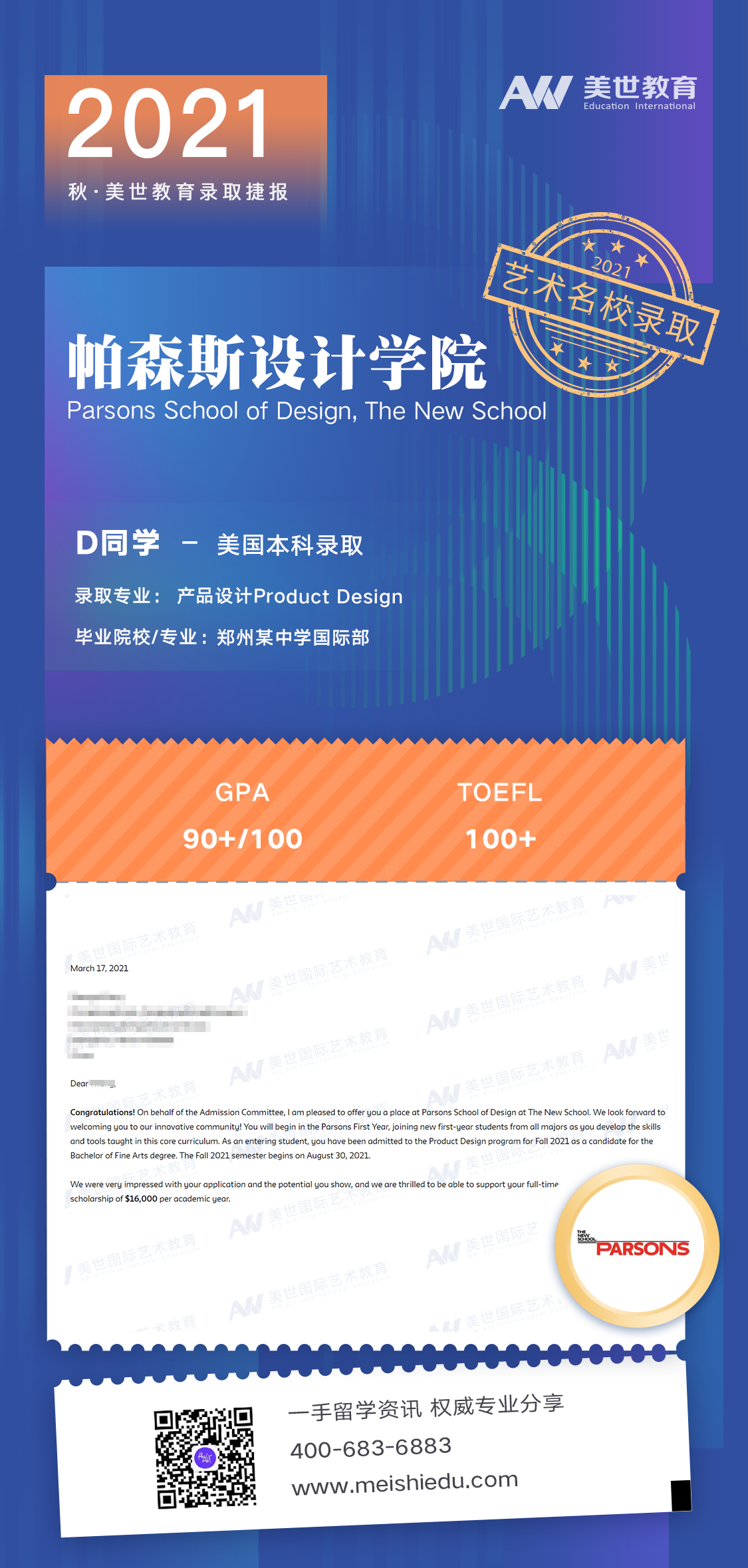 来自郑州的美世D同学,一举获得全美顶尖设计院校——帕森斯设计学院的offer,同时获得每年18000美金的奖学金;D同学同时获得美国艺术中心设计学院产品设计专业的本科录取,该校在QS世界排名艺术设计学院前10。学院培养出了一批实力强的设计师与艺术家:包括宝马首席设计师Chris Bangle、小米公司联合创始人刘德、《珍珠港》《变形金刚》导演迈克尔·贝、诺基亚首席设计师Frank Nuovo、特斯拉汽车公司汽车设计师Franz von Holzhausen等。